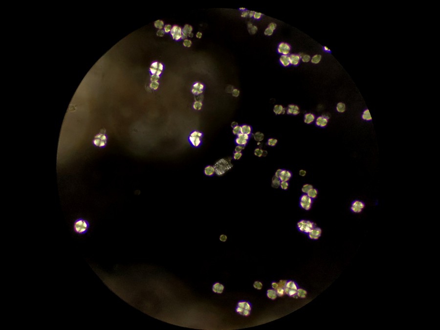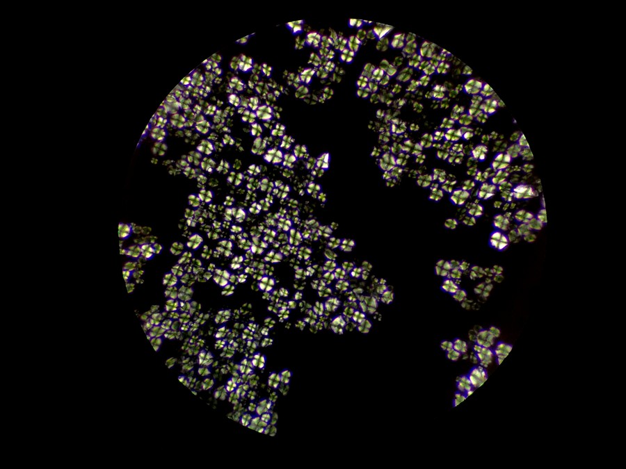 在其他視野中,我們也看到了一些其他偏光反應(yīng),可能是草酸鈣簇晶之類成分,也可能是玻片或者水中的雜質(zhì)。