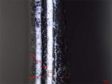 首先將樣本剪切至指甲蓋大小,然后用夾具進行固定,使樣本橫截面朝上放置在顯微鏡載物臺上,調節(jié)物鏡至合適工作距離,觀察樣品縱斷面的厚度,鏡下如圖: