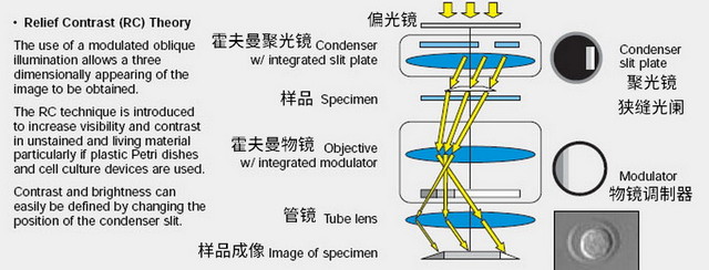 霍夫曼調(diào)制相襯(Hoffman Modulation Contrast,簡(jiǎn)稱(chēng)HMC)是ROBERT HOFFMAN教授于1975年提出的一種觀察方式①,是基于斜照明技術(shù)加入偏振鏡、狹縫光闌和調(diào)制器改進(jìn)而來(lái)的一種透明樣品觀察技術(shù),特點(diǎn)是有三維立體感,且適用于塑料培養(yǎng)皿,有人稱(chēng)之為“窮人的DIC”,主要用于IVF注射等顯微操作。
