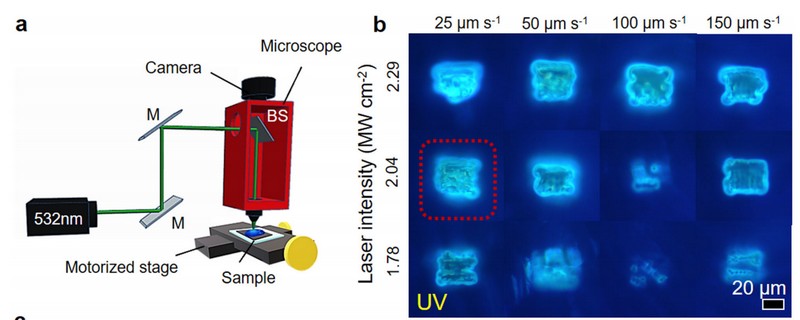 使用不同功率的聚焦激光作為光源,100X物鏡搭配電動(dòng)載物臺(tái)進(jìn)行局部加熱刻印測(cè)試,以找到均勻加熱的最佳功率和速度,結(jié)論是2.04MW/cm2功率激光,25μm/s速度時(shí)效果最佳。