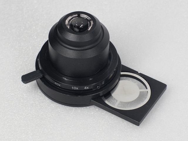 原則上,透射的暗場觀察無需特別的暗場物鏡,直接用普通物鏡即可。例外情況是100X物鏡,由于100X物鏡的N.A起碼都有1.25,而暗場照明要求照明N.A顯著大于物鏡N.A,因此連上述的U-DCW油浸式暗場聚光鏡都帶不動(dòng)一個(gè)普通Plan 100X. 為了滿足暗場使用,部分100X物鏡會(huì)加入可變光闌,用來降低物鏡N.A,以匹配暗場聚光鏡N.A.