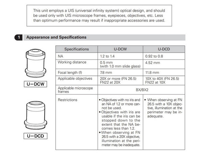 專業(yè)的暗場聚光鏡有很多種,特點(diǎn)是特殊結(jié)構(gòu),帶來特別高的N.A.以UIS系統(tǒng)的U-DCW油浸式暗場聚光鏡為例,其照明N.A可以到1.2-1.4,可以使用20X以上,N.A1.2以下的高倍物鏡。這種聚光鏡使用比較費(fèi)工夫,需要對中,并且滴油時(shí)不能有氣泡,否則暗場效果不佳。