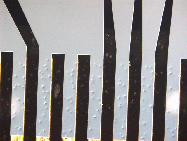 比如在液晶面板ACF層結(jié)構(gòu)中有導(dǎo)電粒子,其填充情況對面板良率有極大影響,使用DIC照明可以看到導(dǎo)電粒子形成的微小凸起,從而快速評估工藝結(jié)果是否符合預(yù)期。此外液晶屏噴漆的漆體顆粒、液晶屏細(xì)微劃痕等瑕疵,也可以使用DIC觀察發(fā)現(xiàn)。