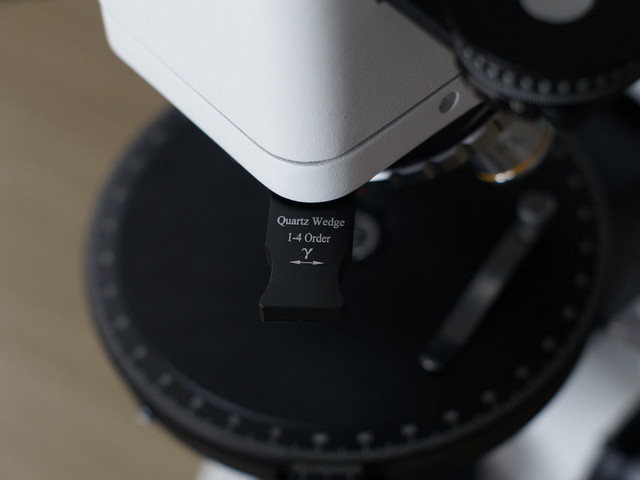 ②帶刻度的旋轉(zhuǎn)式載物臺(tái):調(diào)整樣品中心位置并旋轉(zhuǎn),記錄偏振圖像變化時(shí)的轉(zhuǎn)動(dòng)角度??梢詫?shí)現(xiàn)正交偏光下的消光觀察,礦片在正交偏光鏡下呈現(xiàn)黑暗的現(xiàn)象稱為消光,按旋轉(zhuǎn)360°是否出現(xiàn)四次消光,可判斷區(qū)分均質(zhì)體礦片和非均質(zhì)體礦片。