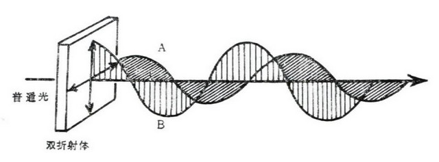 晶體在光學(xué)性質(zhì)上具有雙折射性,也稱各向異性,即光線在通過(guò)晶體時(shí),分解成兩種振動(dòng)方向互相垂直且傳播速度不等的偏光,如上圖光經(jīng)過(guò)晶體(雙折射體)后,被分解成A光和B光兩個(gè)偏振光,他們方向相互垂直,但相位不同,其差異與雙折射體厚度相關(guān)。