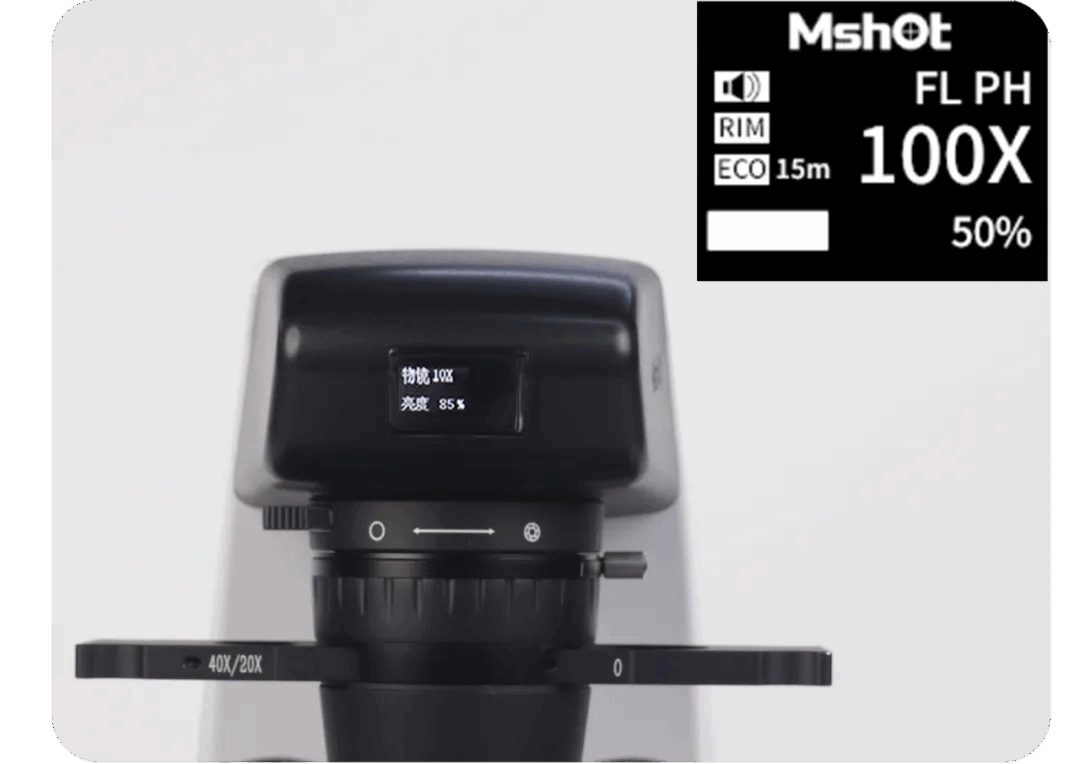 直觀可量化的數(shù)顯屏幕:機(jī)身自帶OLED數(shù)顯屏幕,不僅可以顯示RIM光強(qiáng)管理器、ECO人走燈滅功能的狀態(tài),還能提示物鏡種類、倍率以及量化的光強(qiáng)信息,方便做比對(duì)實(shí)驗(yàn)和定量實(shí)驗(yàn)。