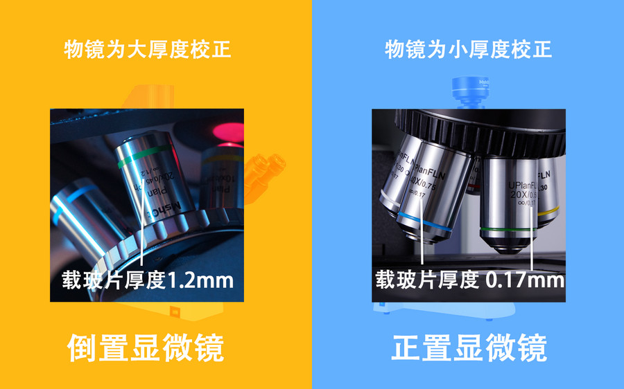 正置顯微鏡的物鏡是為很薄的蓋玻片校準(zhǔn)的,鏡身相關(guān)標(biāo)記是0.17之類很低的數(shù)值;倒置顯微鏡是為較厚的載玻片、培養(yǎng)皿底部校正的,鏡身相關(guān)標(biāo)記會(huì)是1以上的數(shù)值。兩者物鏡因此無法通用,可以據(jù)此區(qū)分正置顯微鏡和倒置顯微鏡。