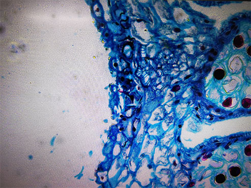 挑好一根粗細(xì)、濕度合適的樹枝,用專門的工具對其進行切片。切片一定要非常薄,太厚會阻礙光透過切片,在顯微鏡下成像不清晰,影響觀感。