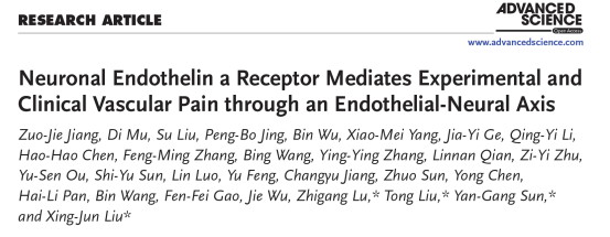 近日,南通大學藥學院劉興君教授團隊聯(lián)合國內(nèi)多個院所在國際頂級期刊《Advanced Science》(影響因子14.3)發(fā)表重磅研究,首次揭示血管內(nèi)皮細胞通過ET-1/ETAR信號通路調(diào)控血管痛的全新機制。