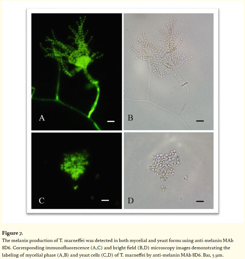 進一步研究馬爾尼菲籃狀菌的致病性,用FITC標記真菌黑色素,證明無論是菌絲態(tài)還是酵母態(tài),都出現明顯的熒光反應,顯示馬爾尼菲籃狀菌雙態(tài)下都有真菌黑色素作為毒力因子,干擾宿主免疫系統正常響應,這可能是其能在體內深層引起多器官感染的其中一個原因。