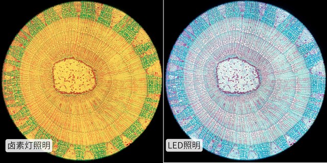 目前專業(yè)LED光源已逐步成為主流,其色溫恒定在5000K左右,接近日光的平均色溫,顯色性較好,人眼觀察和數(shù)字相機成像都有較好效果。此外LED光源功耗低亮度高,一般3W LED可以達到30W鹵素?zé)艄鈴?,方便即開即用,壽命長,免維護,因此明美大部分顯微鏡均默認采用LED作為明場光源,鹵素?zé)魟t作為可選。