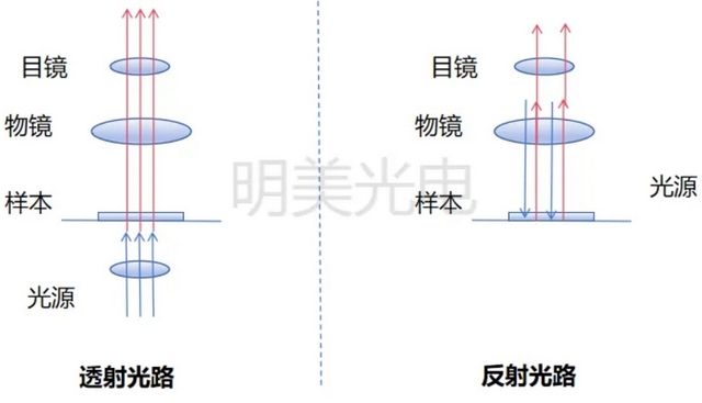 透射與反射(落射)光路示意圖