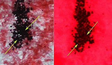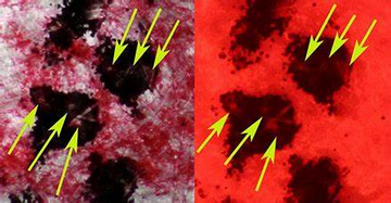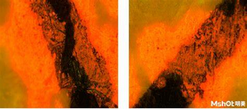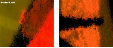 如下圖;左圖為明場(chǎng)透射光的圖片,右圖為熒光圖,對(duì)比左右兩圖可以發(fā)現(xiàn),在交叉部位的非孔漏處有熒光,即為先墨后朱。