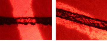 如下圖;左圖為明場(chǎng)透射光的圖片,右圖為熒光圖,對(duì)比左右兩圖可以發(fā)現(xiàn),在交叉部位的所有非孔漏處都無熒光,即為先朱后墨。