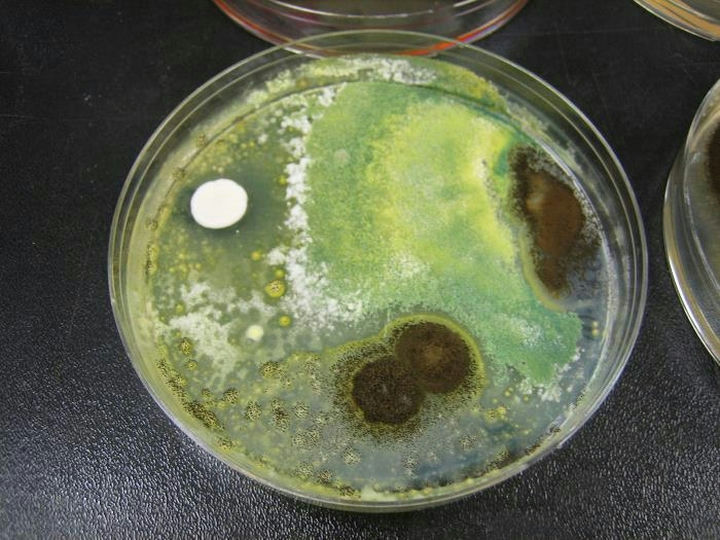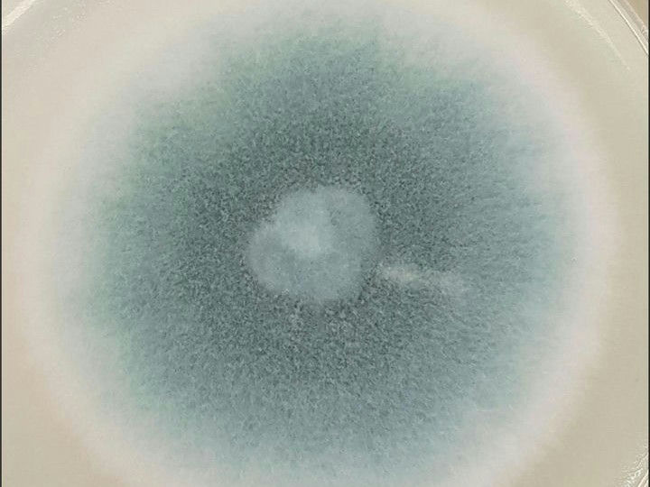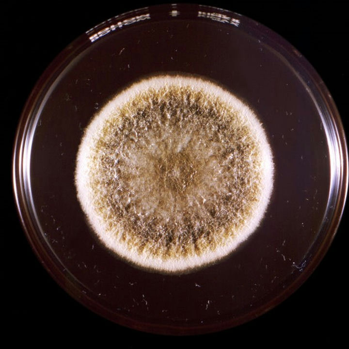 培養(yǎng)皿中看到,菌落生長(zhǎng)較快,結(jié)構(gòu)疏松,表面灰綠色,背面無色或略呈褐色。