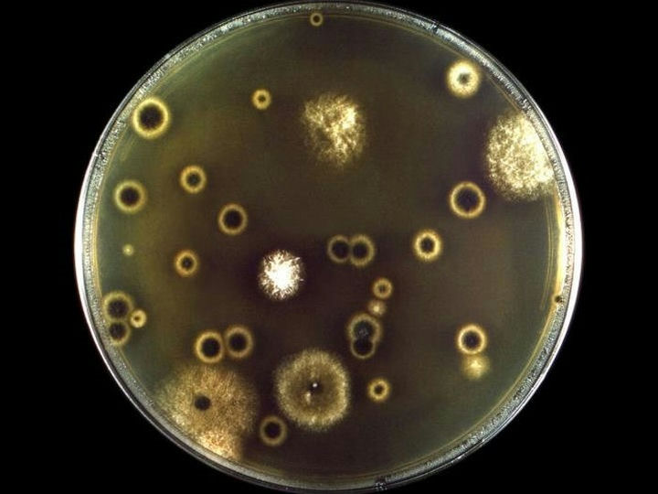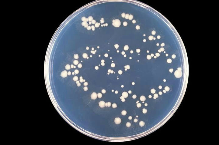 在培養(yǎng)皿中觀察,菌落初呈白色,1周后轉(zhuǎn)淡黃或棕黃、濕潤粘稠,狀似膠汁,因?yàn)榫湫屡f顏色差異會(huì)形成深色主體+淺色外環(huán)。