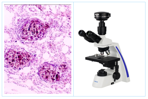 用正置生物顯微鏡ML31/ML45/ML51-N搭配顯微相機MD60/MDX10,在明場觀察下,使用100倍油鏡來感測切片中的細胞形態(tài),可從鏡下觀察是否存在異常形態(tài)的組織細胞,如下圖中,存在著塵細胞性肉芽腫。