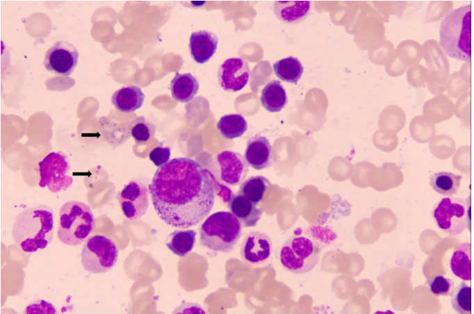骨髓涂片檢查顯示紅細胞嗜堿性點(箭頭)