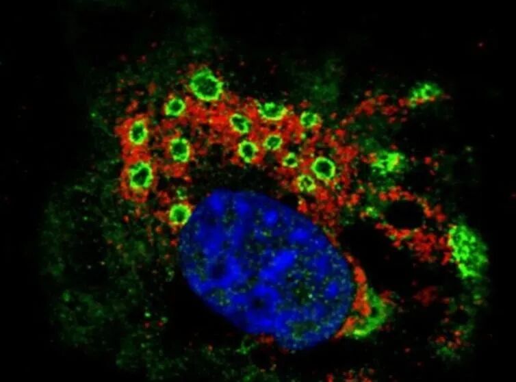 被輪狀病毒(綠)感染的細胞,已經(jīng)開始空泡化