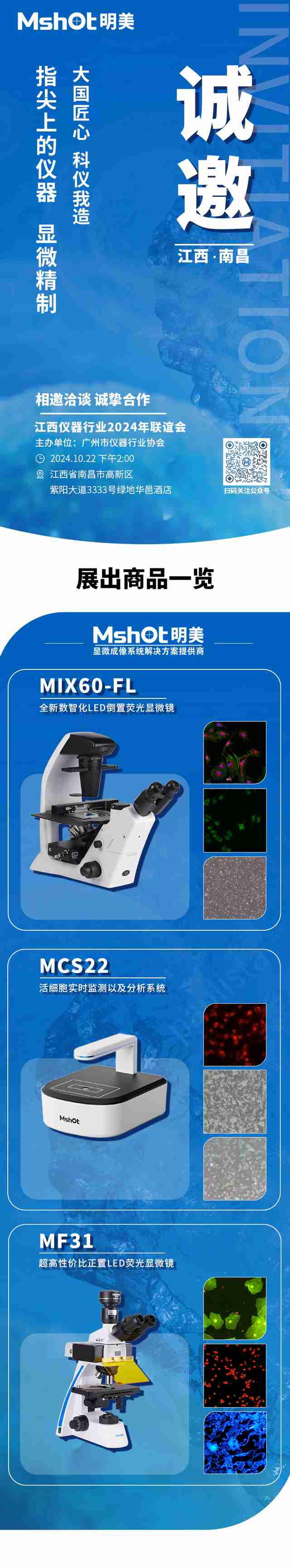 江西儀器行業(yè)2024年聯(lián)誼會,將于10月22日在南昌綠地華邑酒店舉行,MSHOT明美將攜倒置熒光顯微鏡MIX60-FL、活細胞成像儀MCS22、正置熒光生物顯微鏡等重磅產(chǎn)品亮相本次活動,歡迎蒞臨參觀指導。